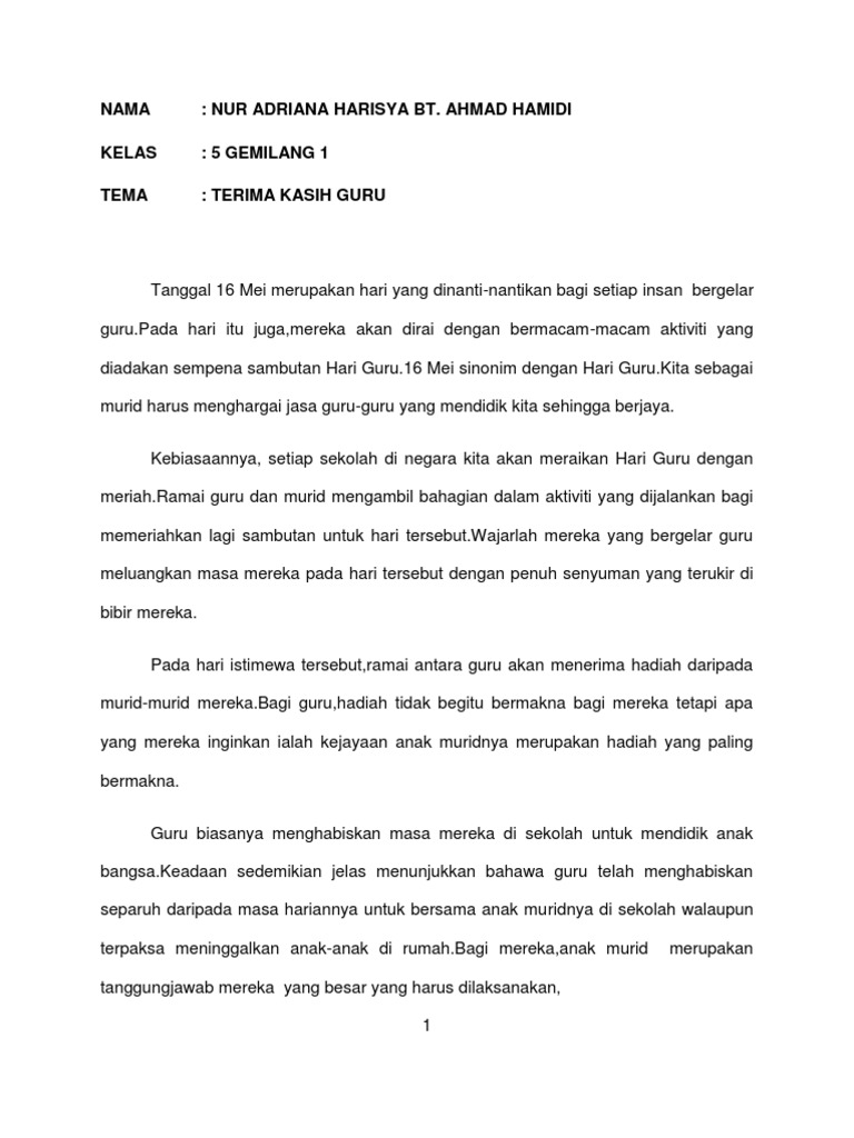 Nama Nur Adriana Harisya Bt Ahmad Hamidi Kelas 5 Gemilang 1 Tema Terima Kasih Guru