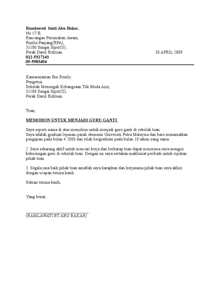 Surat Mohon Jawatan Guru Ganti Ppd Kerian