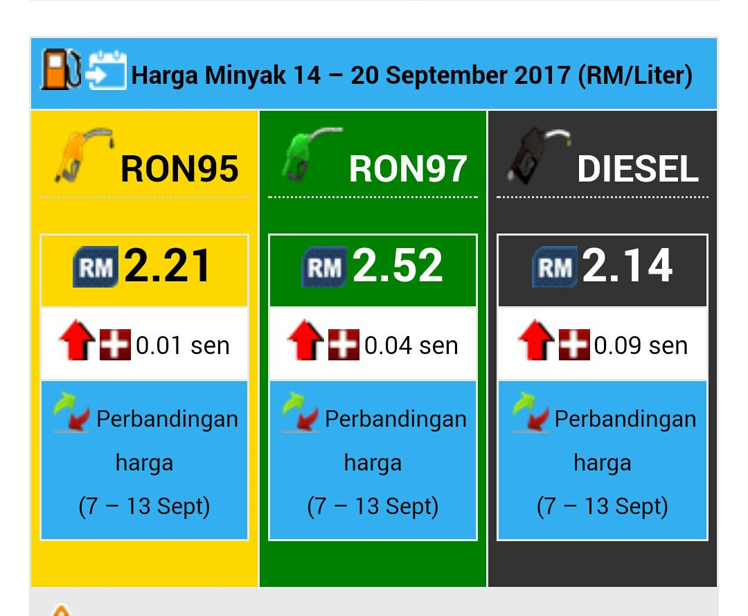 Harga Minyak Naik Petrol Price Ron 95 Rm2 21 97 Rm2 52 Diesel Rm2 14 14 20 September 2017