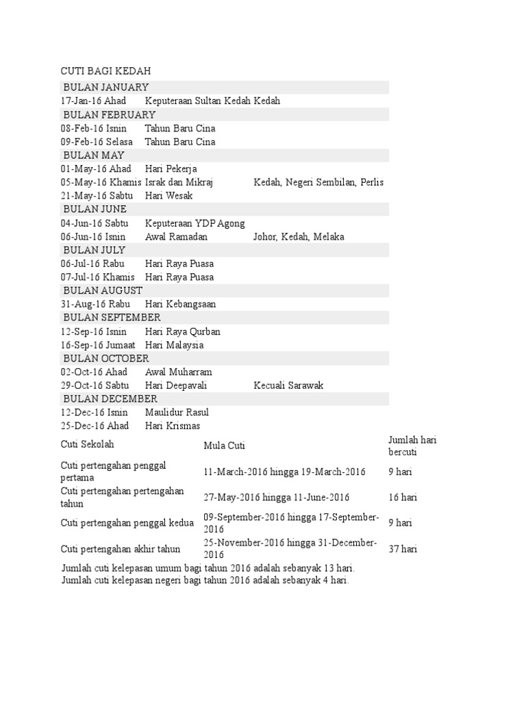 Kalendar Cuti Umum Dan Cuti Sekolah 2016 Malaysia Doc