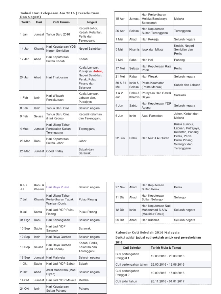 Kalendar Cuti Umum Dan Cuti Sekolah 2016 Malaysia Doc