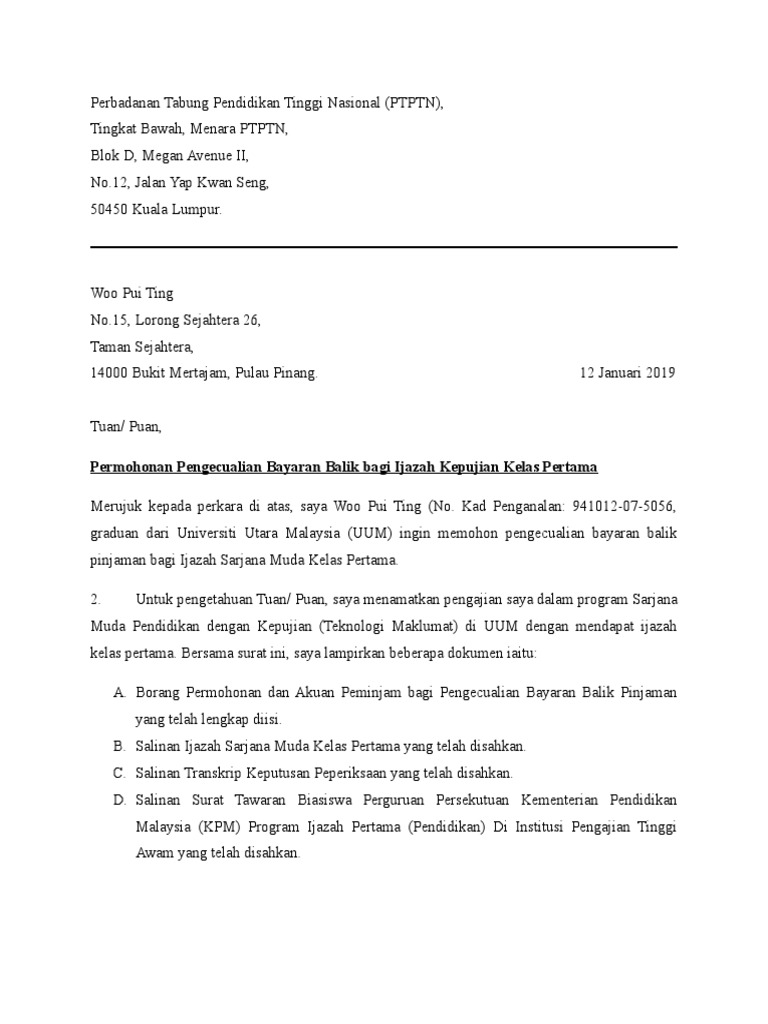 130840642 Permohonan Pengecualian Ptptn Bagi Pemegang Ijazah Kelas Pertama