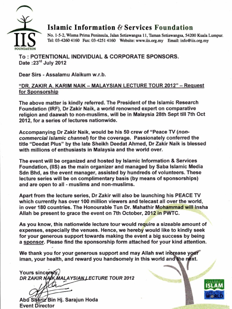 Dr Zakir Naik Sponsorship Team Letter Biodata Schedule Sponsorship Form Religion And Belief Qur An
