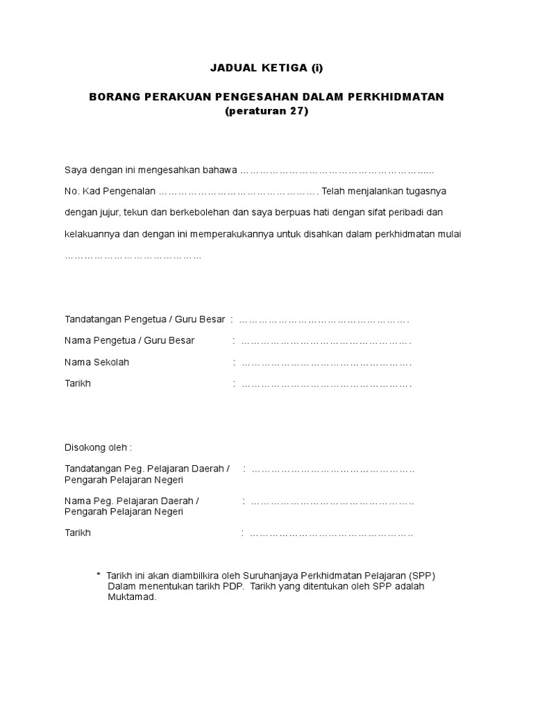 Jadual ketiga i borang perakuan pengesahan dalam perkhidmatan peraturan 27 jabatan perkhidmatan veterinar borang download our borang spp k 002 ebooks for similar books borang spp k 002 borang pengesahan dalam jawatan spp. Borang perakuan pengesahan dalam perkhidmatan peraturan 27 saya dengan ini mengesahkan no. Pengenalan telah menjalankan tugasnya dengan jujur tekun dan berkebolehan dan saya berpuas hati dengan sifat peribadi dan kelakuannya dan dengan ini memperakukannya untuk disahkan dalam perkhidmatan.
